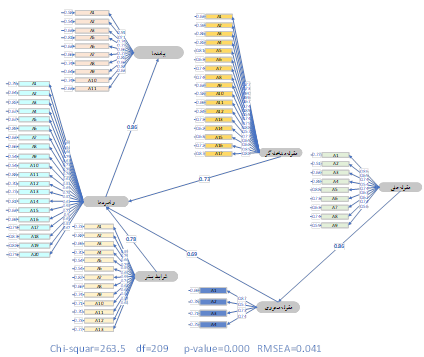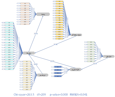 در این مدل، علاوه بر ضرایب مسیر، اعداد معناداری (که از طریق آزمون T به دست آمدهاند) برای هر یک از روابط بین متغیرها محاسبه شده است. با توجه به اینکه برازش مدل تأیید شده است، مقادیر T بهدستآمده نشاندهنده تأثیرات معنادار و قوی بین متغیرها هستند. این اعداد معناداری به محقق کمک میکنند تا روابط مشاهدهشده را ازنظر آماری تأیید کند و تشخیص دهد که آیا این روابط بهاندازه کافی قوی و معنادار هستند که بتوان آنها را بهعنوان نتایج واقعی و معتبر در نظر گرفت.
